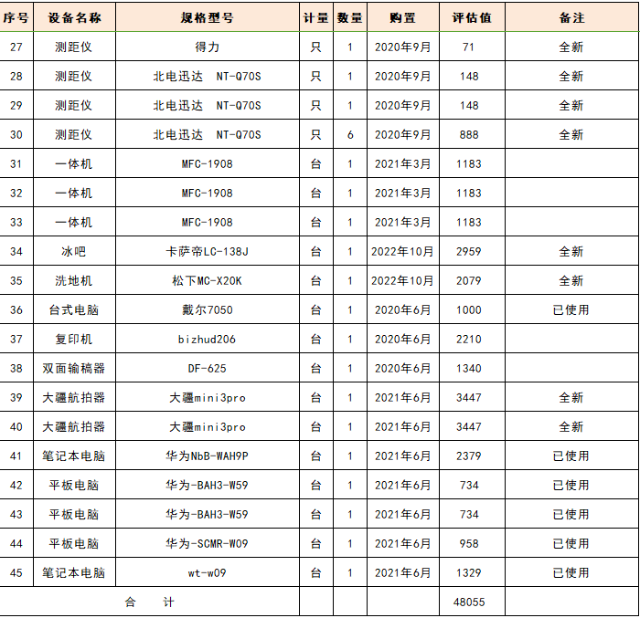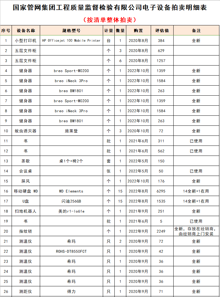 關(guān)注微信公眾號(hào)我公司受委托,將于近期拍賣(mài):國(guó)家管網(wǎng)集團(tuán)工程質(zhì)量監(jiān)督檢驗(yàn)有限公司電子設(shè)備及辦公用品一批,多數(shù)設(shè)備為全新未使用。主要包含:卡薩帝冰吧(全新未使用),大疆航拍器(全新未使用),松下洗地機(jī)(未使用),測(cè)溫儀測(cè)距儀(全新未使用),指紋鎖(全新未安裝),按摩儀(未使用),移動(dòng)硬盤(pán)和U盤(pán)(全新未使用),華為筆記本電腦、復(fù)印機(jī)、打印復(fù)印一體機(jī),文件柜、屏風(fēng)等。